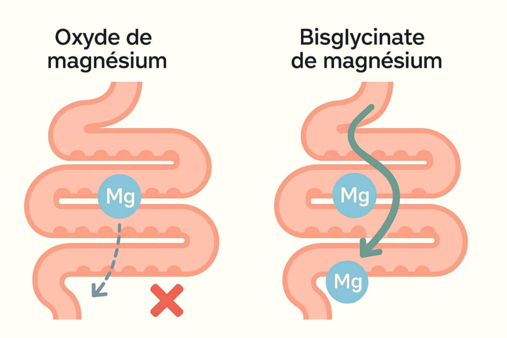 La réponse est simple : le magnésium n’est pas toujours équivalent. Le choix de la forme fait toute la différence. Alors que de nombreux produits utilisent de l’oxyde de magnésium bon marché, à la biodisponibilité très faible, le corps a surtout besoin d’une chose : une forme qu’il peut absorber avec un minimum de pertes.