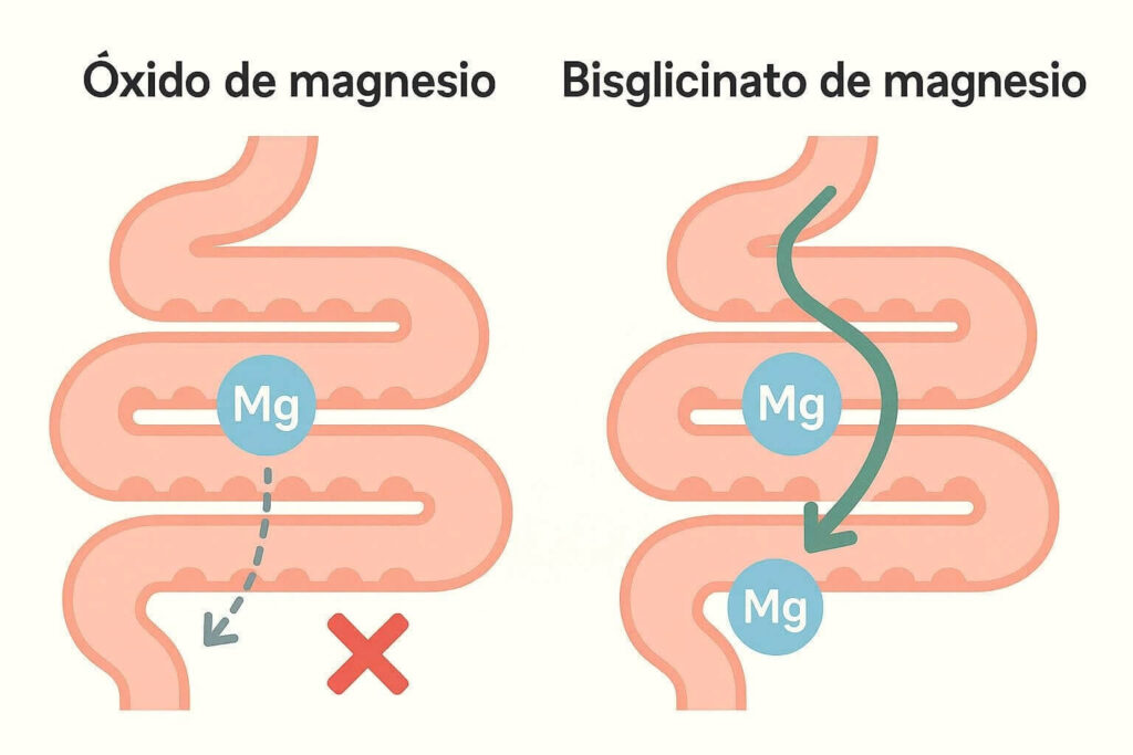 La respuesta es sencilla: no todo el magnesio es igual. La forma química marca la diferencia. Mientras que muchos productos utilizan óxido de magnesio barato, cuya biodisponibilidad es muy baja, el cuerpo necesita ante todo una forma que pueda absorber con las mínimas pérdidas posibles.